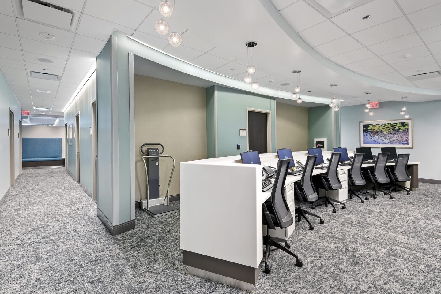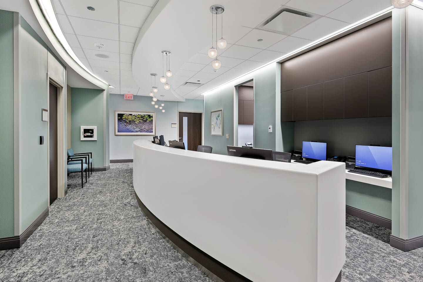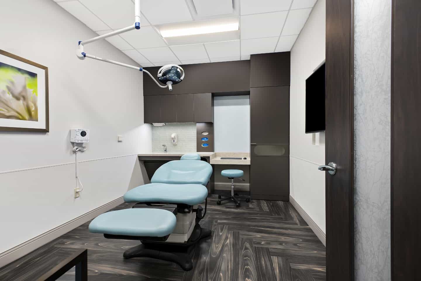 The Northwestern Medical RMG Geneva Dermatology clinic was previously a bank therefore certain elements were preserved and incorporated into the design as requested by the landlord. These elements include an existing drive through window, cash drawer vault, and main vault including vault door, and storage area.