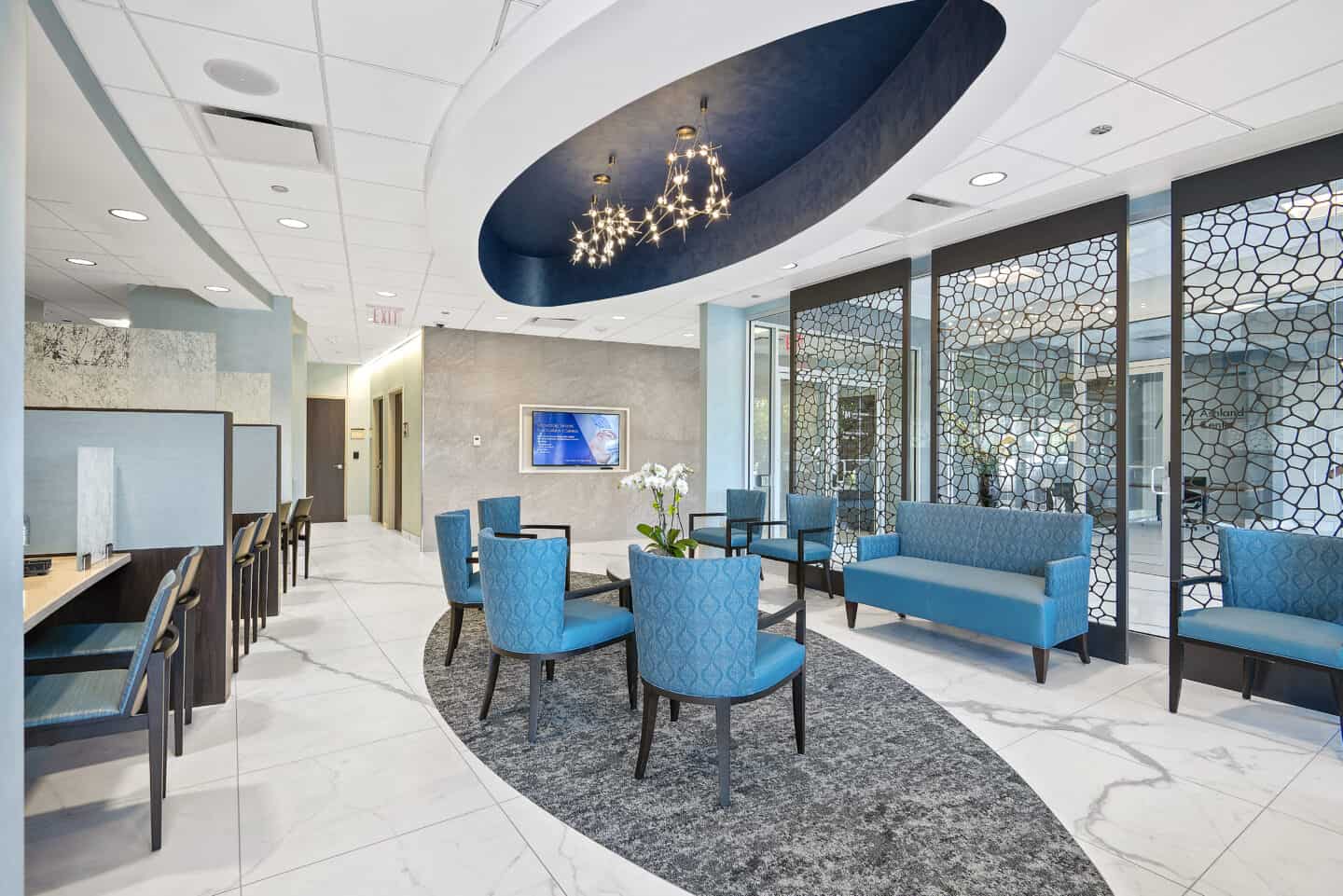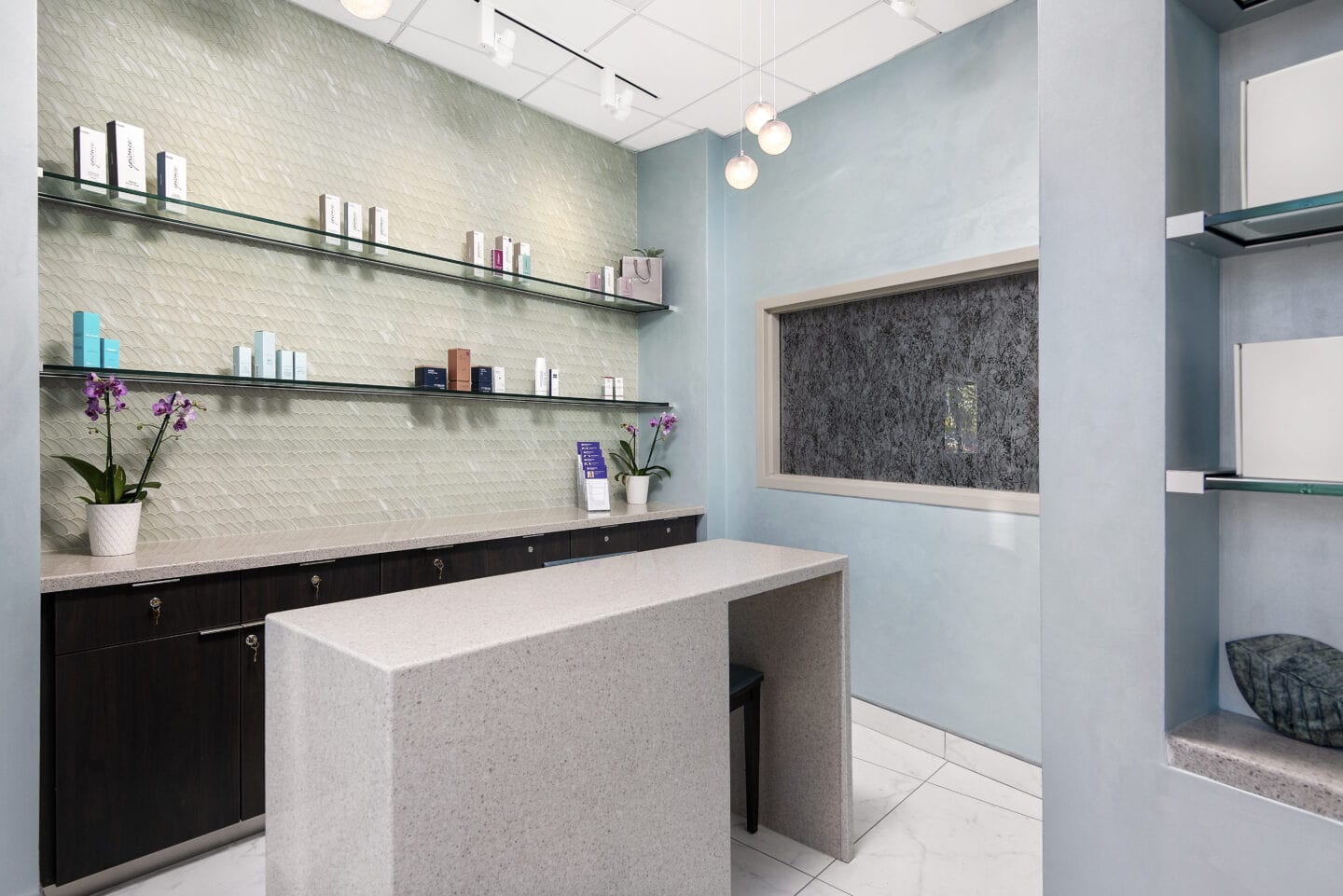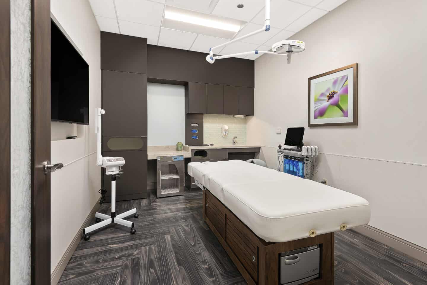 The Northwestern Medical RMG Geneva Dermatology clinic was previously a bank therefore certain elements were preserved and incorporated into the design as requested by the landlord. These elements include an existing drive through window, cash drawer vault, and main vault including vault door, and storage area.